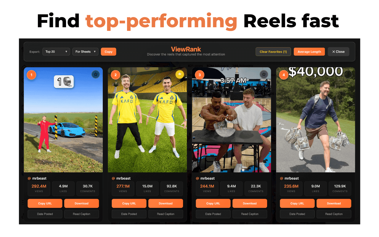 Find any creator's best-performing Reels in seconds, not hours.