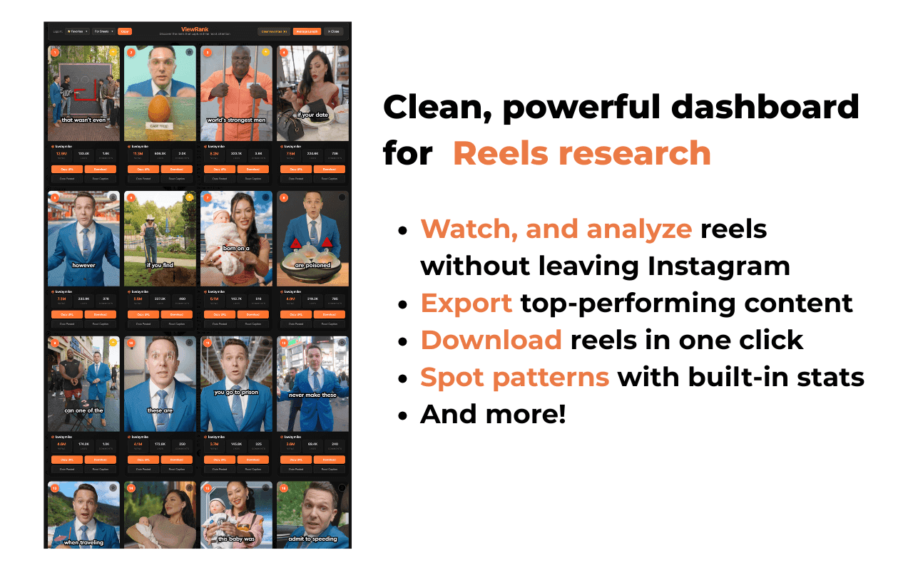 Stop wasting hours manually hunting for Reels with the highest viral potential. ViewRank instantly finds the most viewed, liked, and commented Instagram Reels for you.