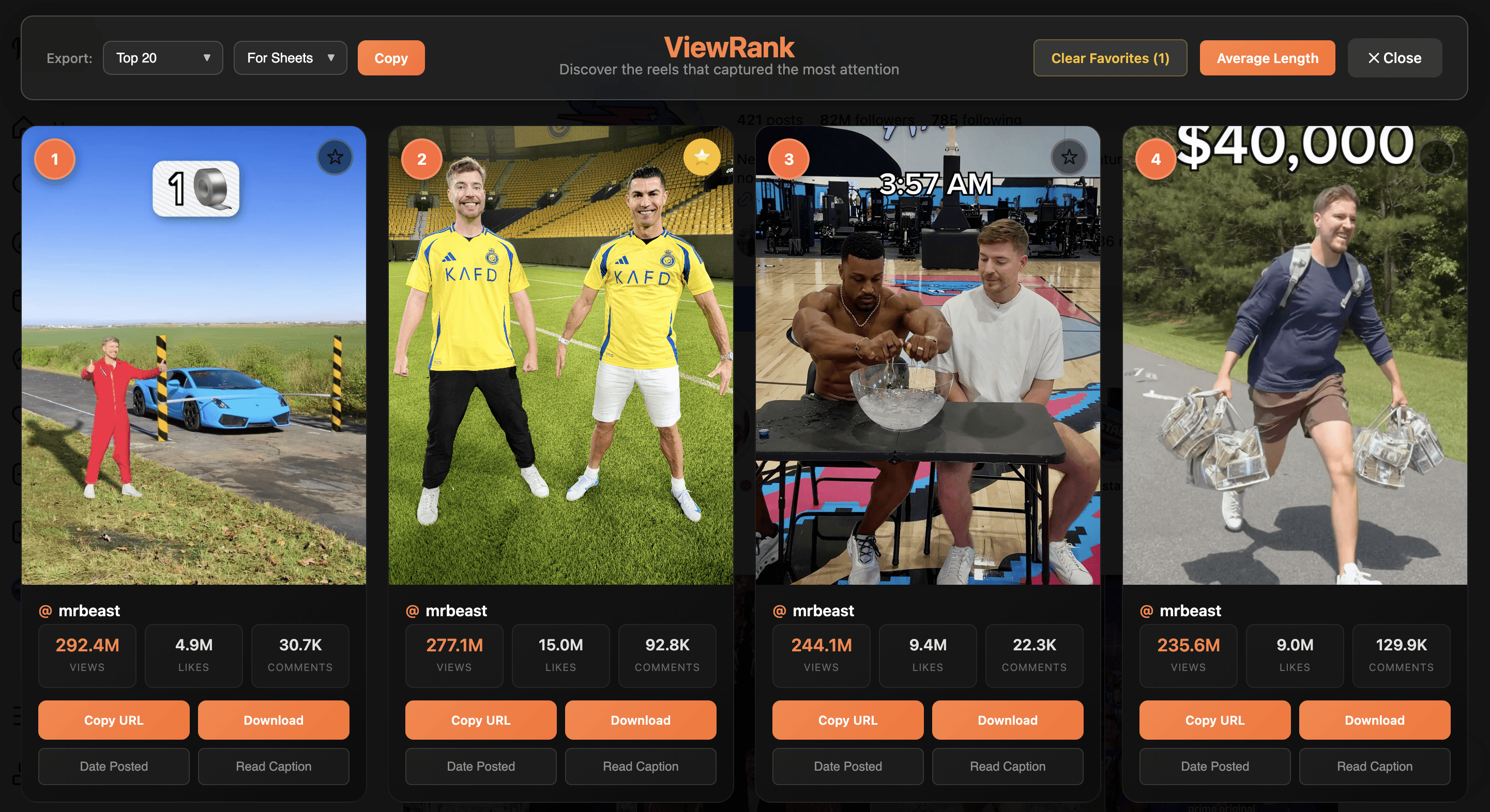 Sort Instagram Reels by views, likes, or comments. Discover what's working. Export your data. All in seconds.